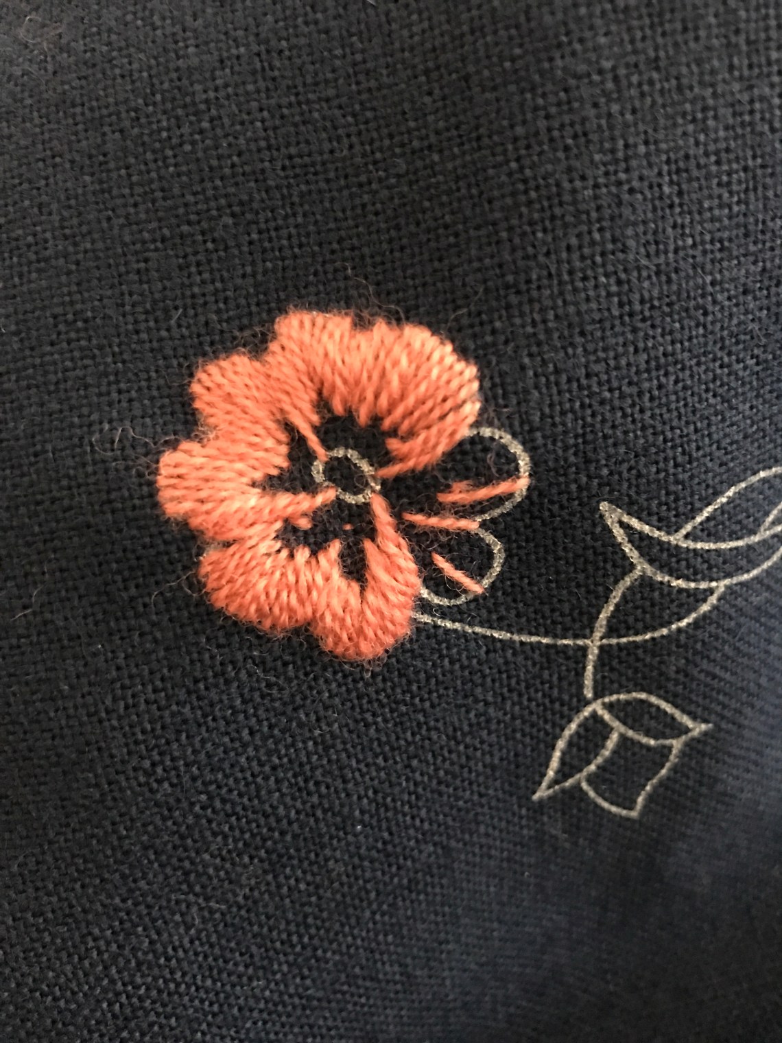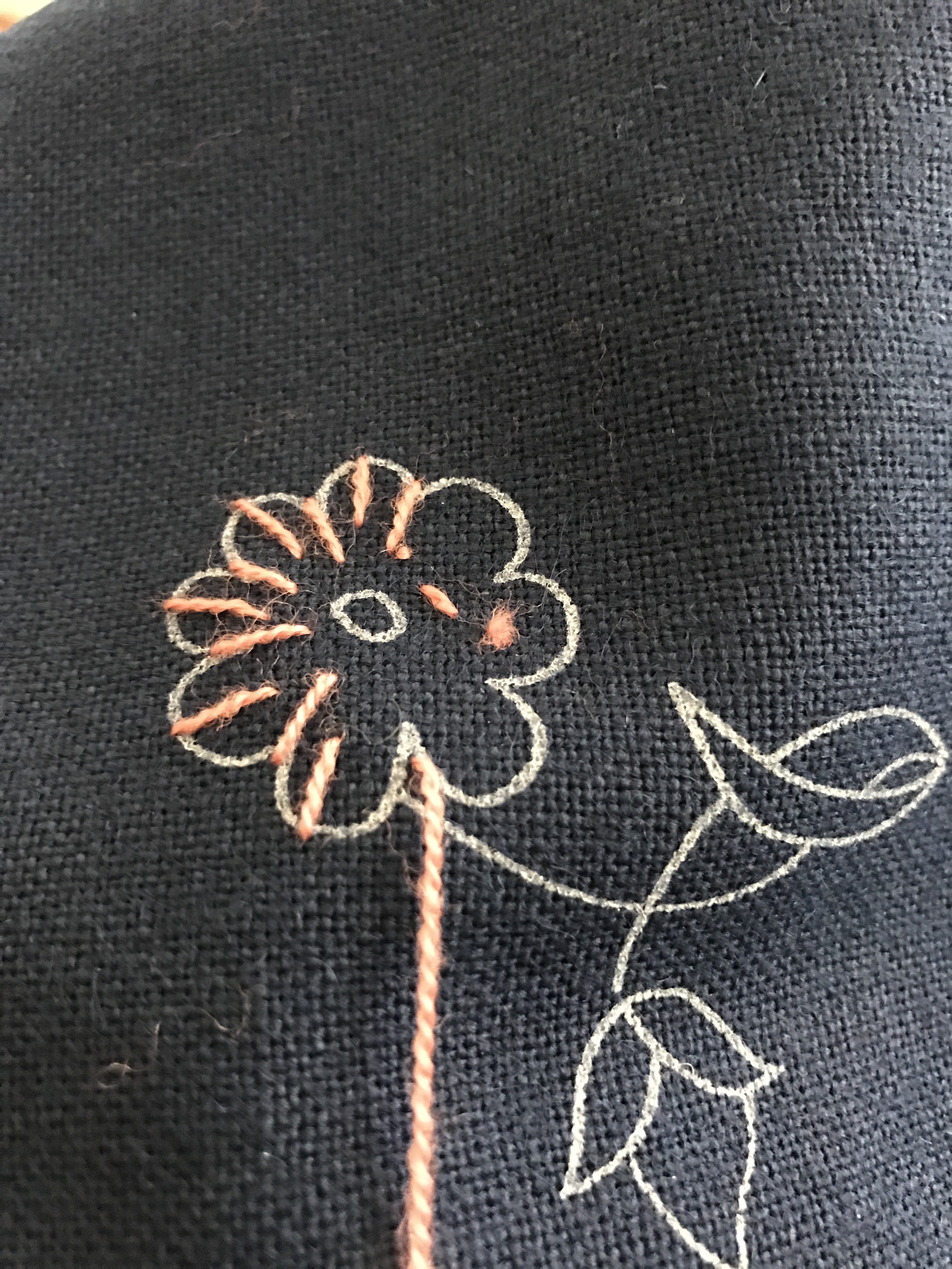 Her ser vi blomsten halvveis fylt og med hjelpesting.Barbro sa hun hadde lært denne teknikken på et broderikurs i England, og at det ikke er så vanlig i Norge. All grunn til å omtale den her. Jeg er evig takknemlig for å ha kostet på meg broderikurs.