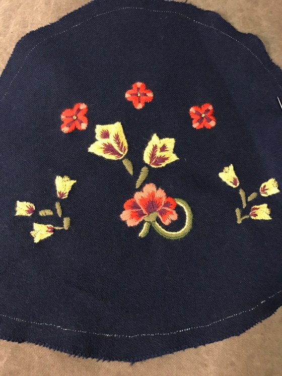 Da var luen ferdig brodert! Stolt, men usikker på om dette er bra nok.